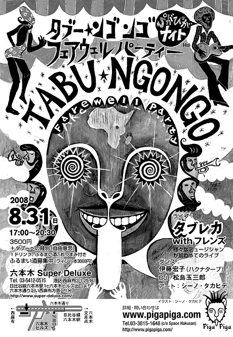 タブレカのタブー・ンゴンゴが、9月はじめに日本の家族といっしょにコンゴ(ザイール)に帰国・移住することになり、ライブやDJ、アートをまじえたフェアウェルパーティーをやることにしました。
