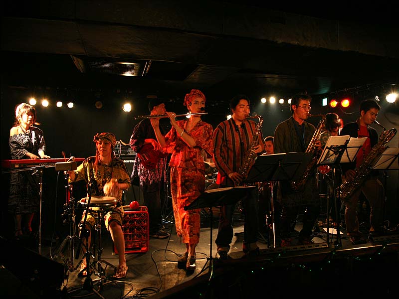 パーカッションでリーダのmi-chang、フルートの真紀、キーボードのnyoriなど、女性が中核になっているのも素敵。近頃は歌ったり、踊ったり、芸域も拡がっている模様。